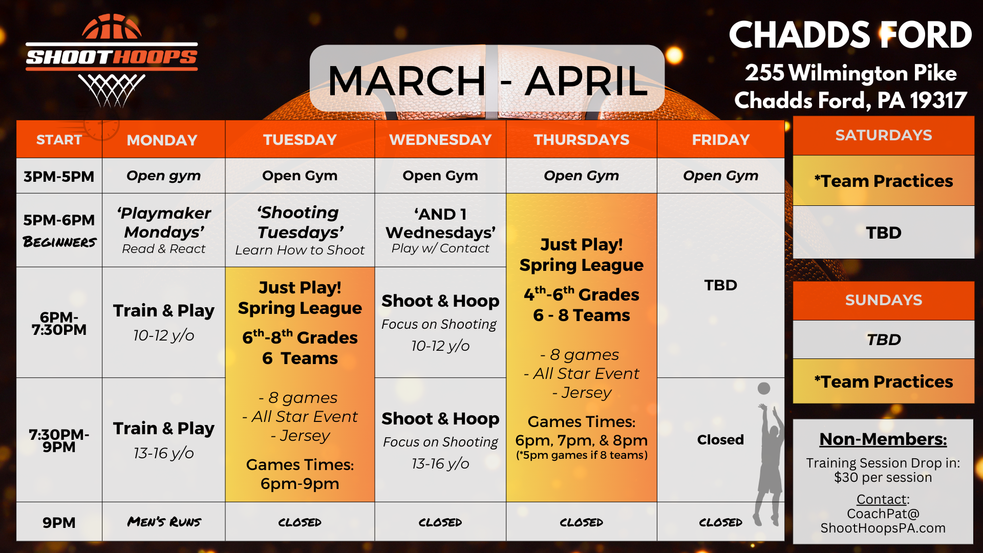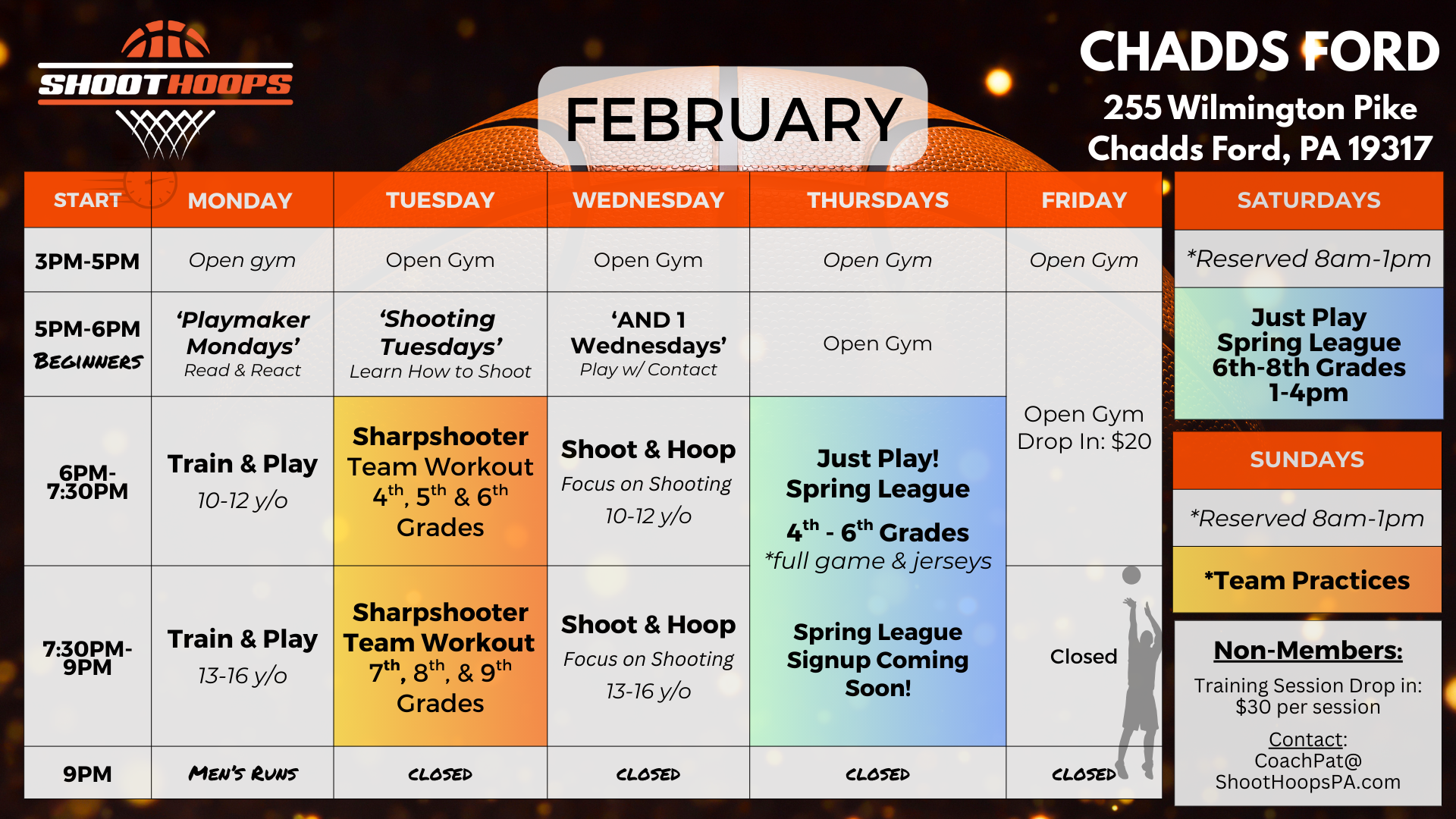 Shoot Hoops Chadds Ford Schedule Upcoming Clinics 'Shoot Hoops U' Series February Schedule (Subject to Change) Spring Schedule Directions to Shoot Hoops Basketball Club