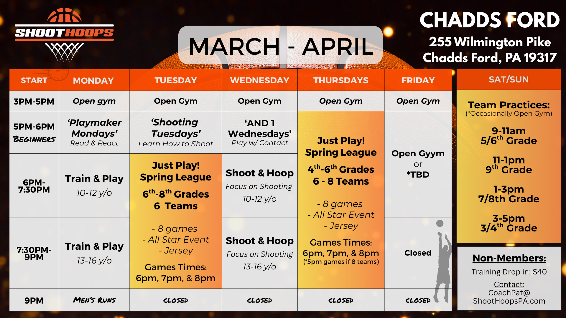 Shoot Hoops Chadds Ford Schedule Upcoming Clinics 'Shoot Hoops U' Series Spring Schedule Directions to Shoot Hoops Basketball Club