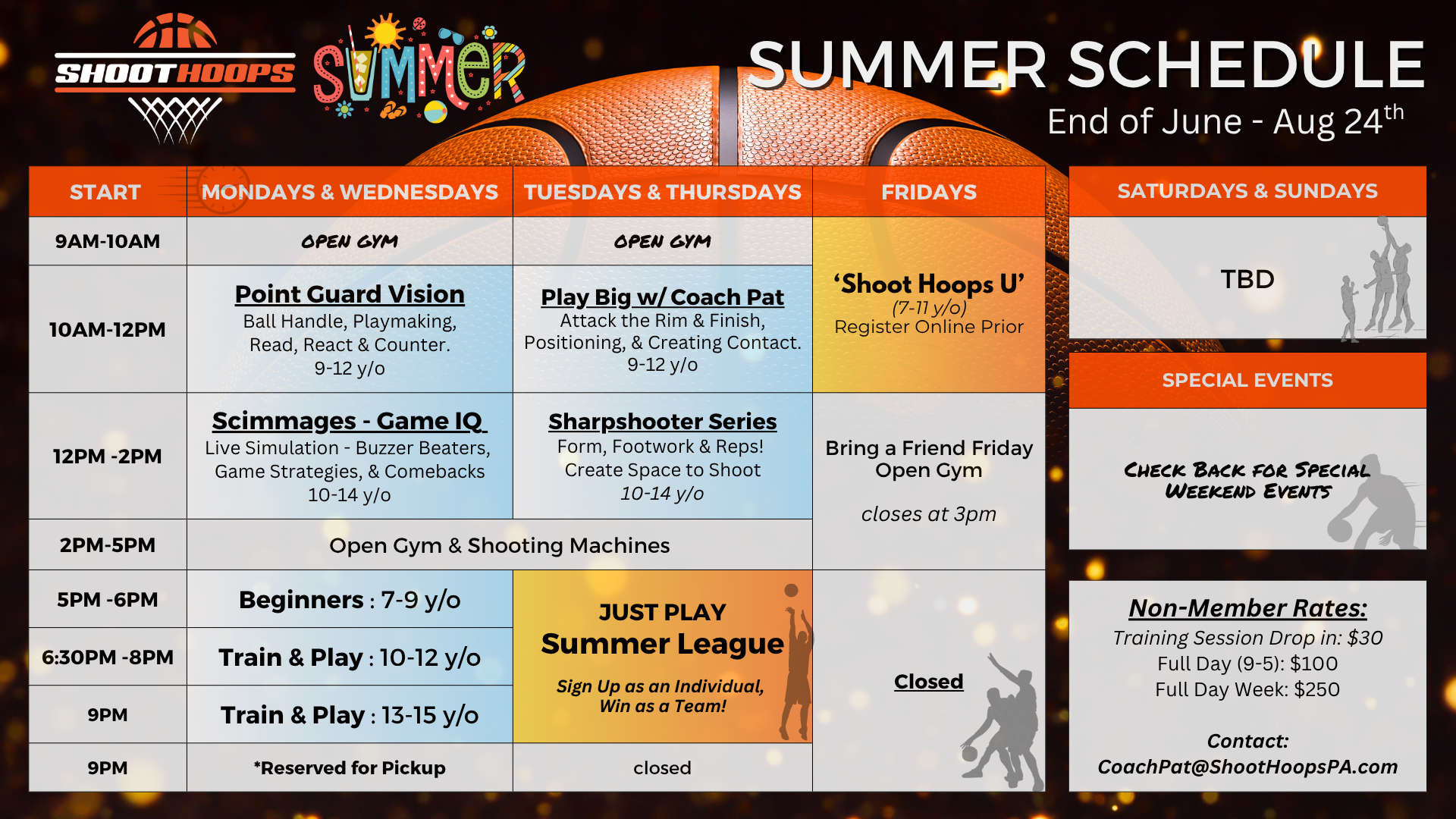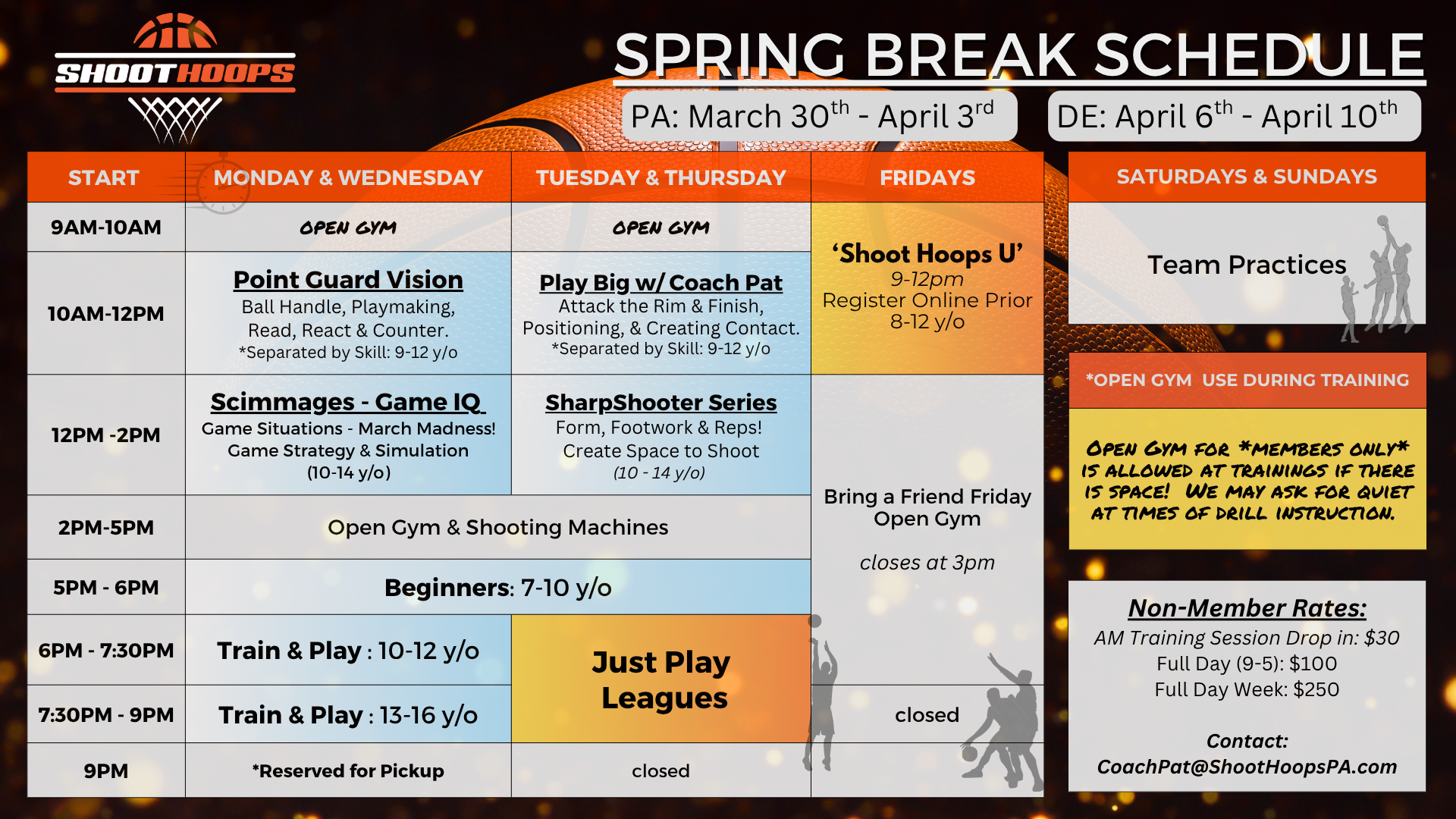 Shoot Hoops Chadds Ford Schedule Upcoming Shoot Hoops U Clinics 'Shoot Hoops U' Series Spring Break Schedule Spring Schedule 2026 Summer Schedule Directions to Shoot Hoops Basketball Club