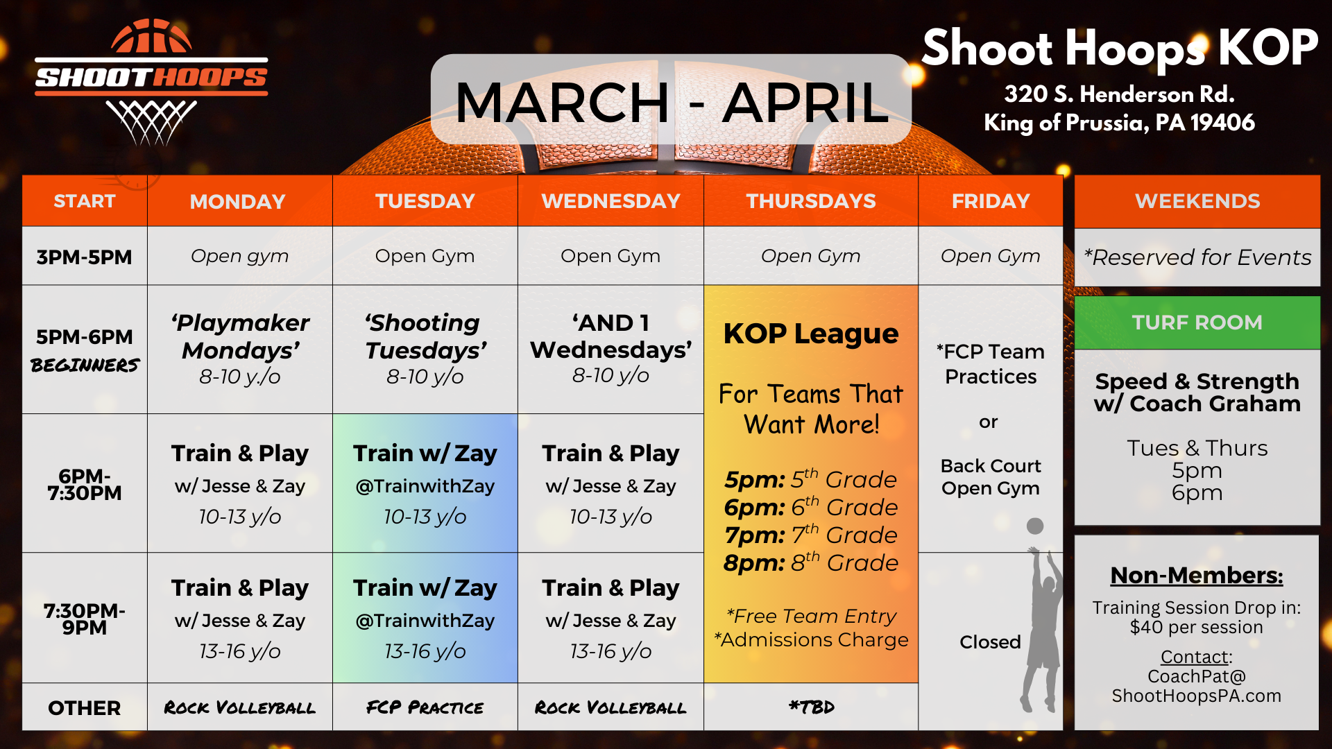 Shoot Hoops KOP Member Schedule Spring Break Clinics Spring Break Showcase! Full Court Philly Train & Play! Spring Schedule Summer Camps Summer Camps Shoot Hoops – King of Prussia Location 320 S. Henderson Rd King of Prussia, PA 19406